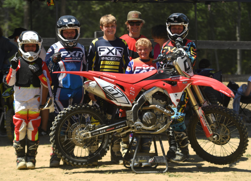 Medomak-area motocross kids hang out with a couple of friends in between races on Saturday, Aug. 2 at Wheeler Spring MX in Bowdoin. From left: Alden Harjula, Cole Harjula, Wes Overlock, Jacoby Severson, Max Overlock, and Brysen Gilchrest. (Mic LeBel photo)