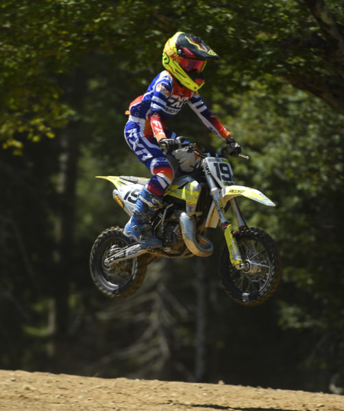 Wes Overlock has his eyes on the track as he sticks a landing on the way to a first place finish in the 85cc Maine Motocross race for ages 12-15 at Wheeler Spring MX in Bowdoin on Saturday, Aug. 2. With the win, Overlock moved into fifth place out of 51 riders in the season standings. (Mic LeBel photo)