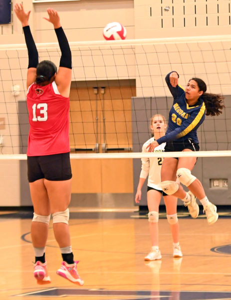Rheanne Simmons attempts to spike over the block of Wiscasset’s Ella Burkhardt during Medomak’s 3-0 win on Tuesday, Oct. 7 in Bath. (Mic LeBel photo)