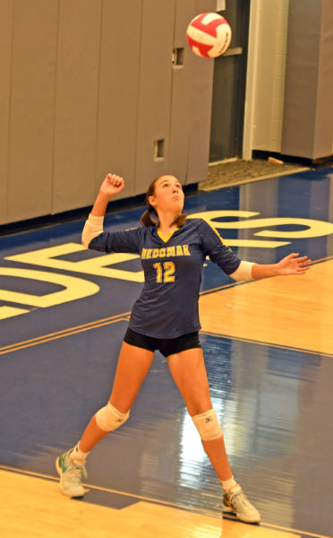 Andi Winchenbach steps into a serve during Medomak’s 3-0 sweep over Wiscasset on Tuesday, Oct. 7 in Bath. (Mic LeBel photo)