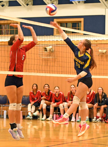 Paige Gerlack spikes the ball during Medomak’s 3-1 loss to Camden Hills on Thursday, Oct. 17 in Waldoboro. (Mic LeBel photo)