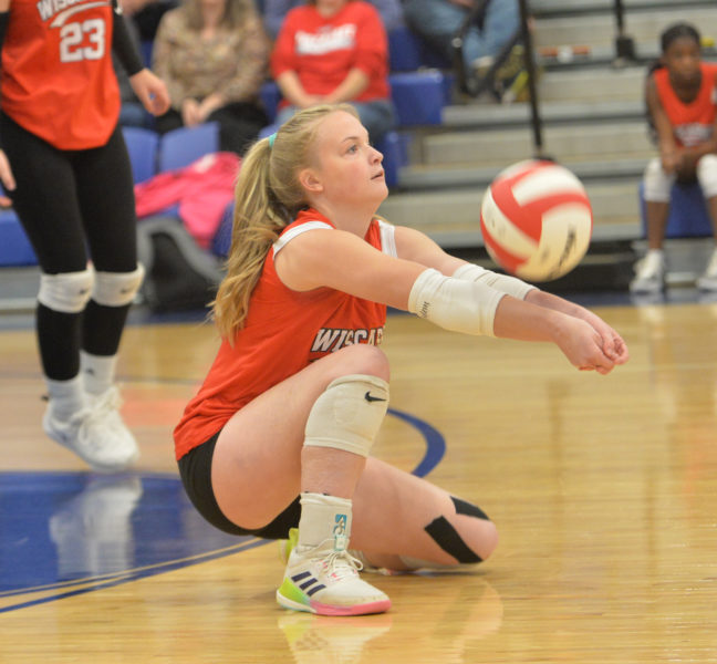 Wells broke Wiscasset’s service with a block by Regan Bedell. Zoe Chabot aced her first serve and the Wells team won the second volley for a 24-21 lead. Sadie West aced her first serve to pull Wiscasset within two, but the Warriors scored their winning point when the Wolverines launched the ball into the net.