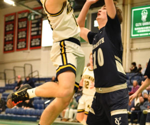- Carter Jackson drives to the basket for a layup during Medomak Valley’s 63-58 loss to Yarmouth in the Class B South regional championship on Friday, Feb. 20 at the Portland Expo. (Mic LeBel photo)
