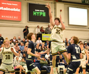 - Mason Nguyen launches a 3-pointer during Medomak Valley’s 63-58 loss to Yarmouth in the Class B South regional championship on Friday, Feb. 20 at the Portland Expo. (Mic LeBel photo)