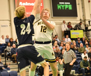 - Owen Dostie releases a shot while on the run in Medomak Valley’s 63-58 loss to Yarmouth in the Class B South regional championship on Friday, Feb. 20 at the Portland Expo. (Mic LeBel photo)