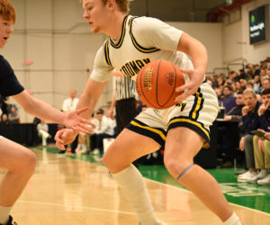 - Owen Dostie protects the ball during Medomak Valley’s 63-58 loss to Yarmouth in the Class B South regional championship on Friday, Feb. 20 at the Portland Expo. (Mic LeBel photo)