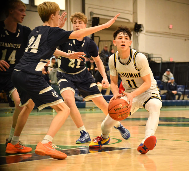 Mason Nguyen draws a crowd and then passes to the open wing during Medomak Valley’s 63-58 loss to Yarmouth in the Class B South championship game on Friday, Feb. 20 at the Portland Expo. (Mic LeBel photo)