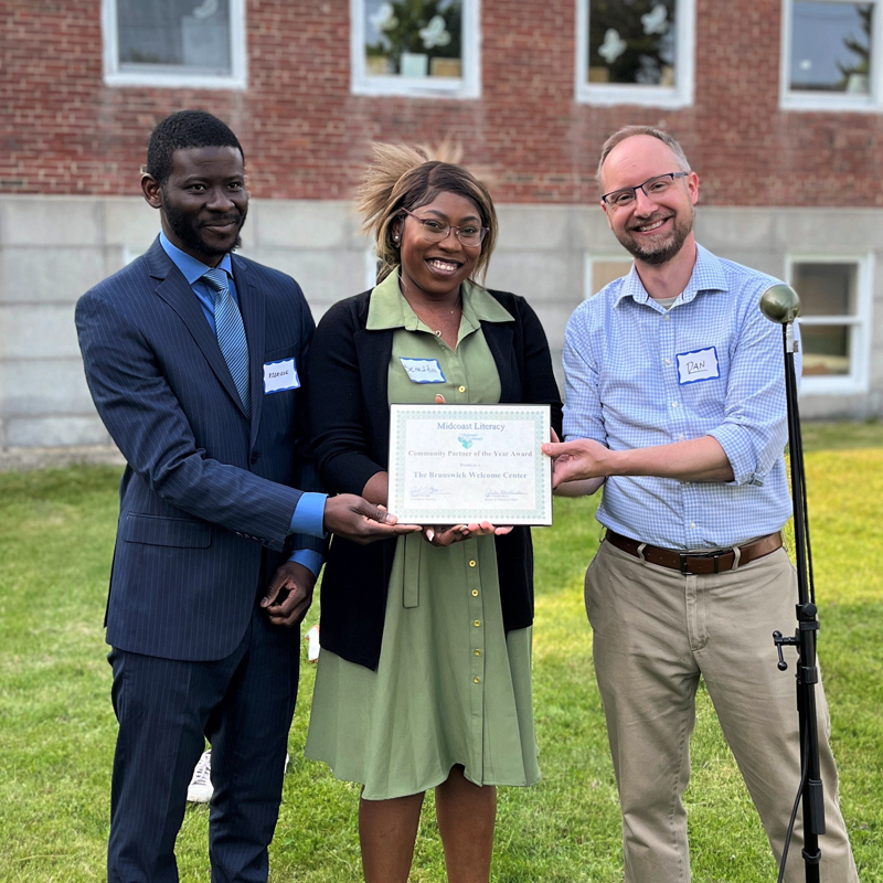 Rodrigue Mwenge and Benedita Kakhuba, of the Brunswick Welcome Center, accept the Community Partner Award from Midcoast Literacy’s Executive Director Daniel Burson. (Photo courtesy Bree Candland)