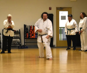 Ben Olmstead was presented with a black belt by sensei Linda Dobson Porter during a Mobius martial arts class at the Central Lincoln County YMCA on Sept. 3 in Damariscotta. Before tying on the black belt in a ritual with his teacher, Olmstead demonstrated his martial arts skills in front of Porter, classmates, friends and family that had gathered at the ceremony.
