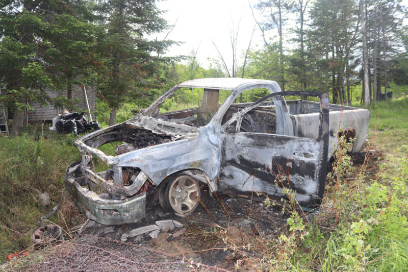 A burnt out truck sits on private property in Somerville after a vehicle fire on June 2. Investigators with the Maine State Fire Marshals Office arrested Ben Alan Manley, 27, of Windsor, in connection to the incident on June 11. (Courtesy photo)