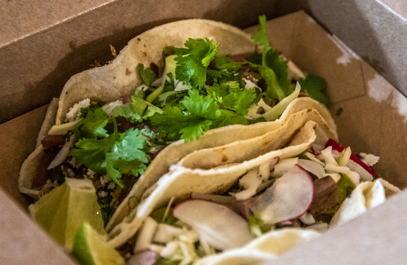 Customers can generally choose from two different varieties. Past options included pork and poblano tacos with tomatillo salsa and pickled red onion; mole spiced butternut tacos with garden greens and queso fresco; carnitas tacos featuring pulled pork with pickled red onion, cilantro and lime; lengua tacos that top beef tongue with salsa verde, onion, and paper-thin slivers of radish; and lamb birria tacos with a red chili braise.