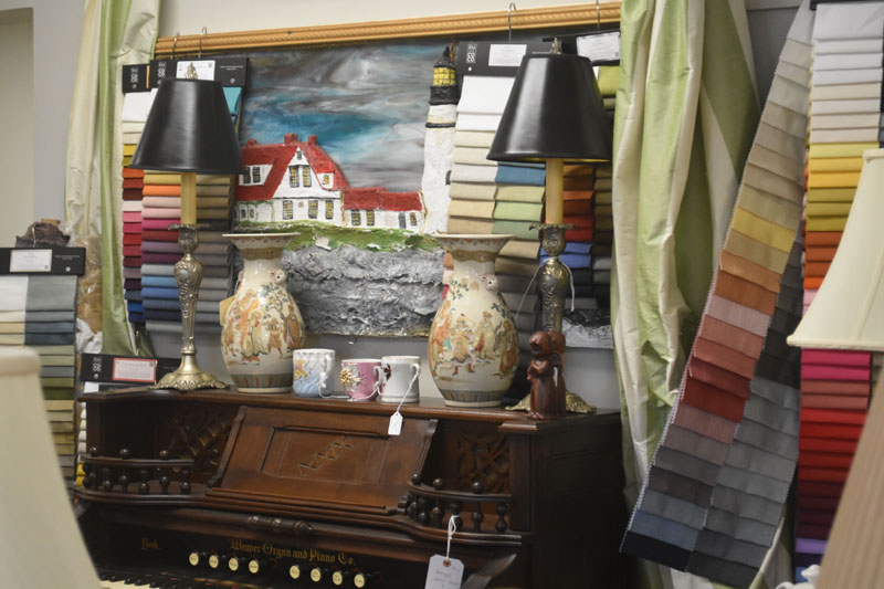 The three-room store just before the bridge to Wiscasset opened in early August with a selection of antiques at a range of prices alongside custom drapery, slipcovers, and more, though Jackson has been sewing professionally from her home studio for more than 30 years.
