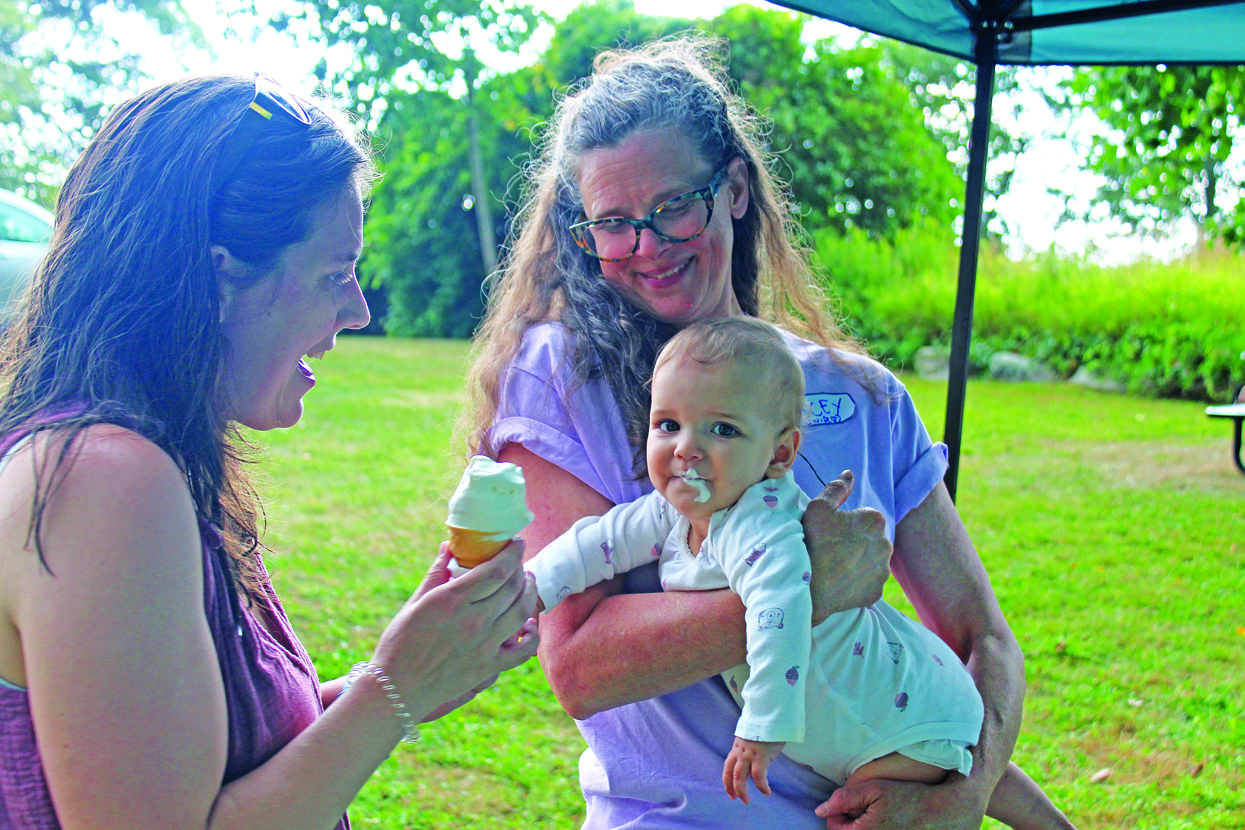 Allison Mitchell Lee, 9 months, enjoys a taste of ice cream provided by her mother Catherine Mitchell (left) while being held by MaineHealth Lincoln Hospital certified nurse midwife Stacey J. Rees. Alumni and staff of the hospital’s maternity ward gathered at Round Top Ice Cream in Damariscotta on Sunday, July 20 to connect over sundaes and meet other children who were born at the Damariscotta hospital and their families. (Molly Rains photo)