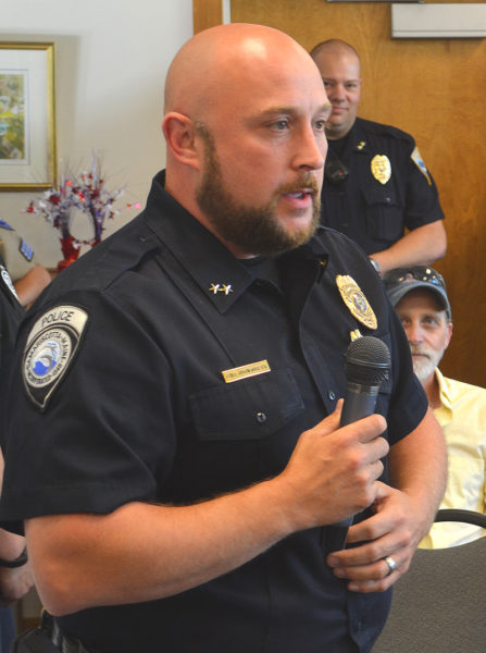 Damariscotta Police Chief Jason Warlick speaks to the Damariscotta Select Board after being sworn in Aug. 1, 2017. After eight years in the role, Warlick will resign as chief on Aug. 1 as he will become the chief deputy of the Sagadahoc County Sheriff’s Office. (Maia Zewert photo, LCN file)