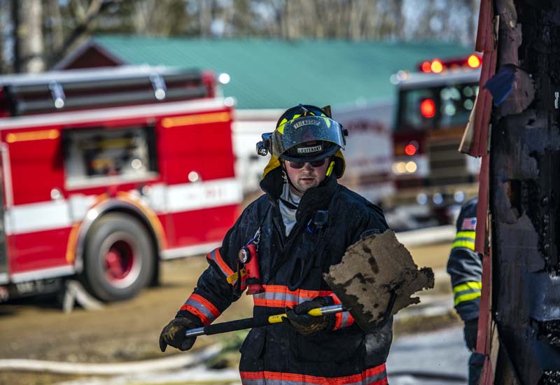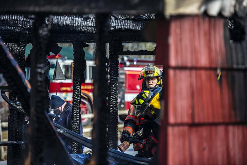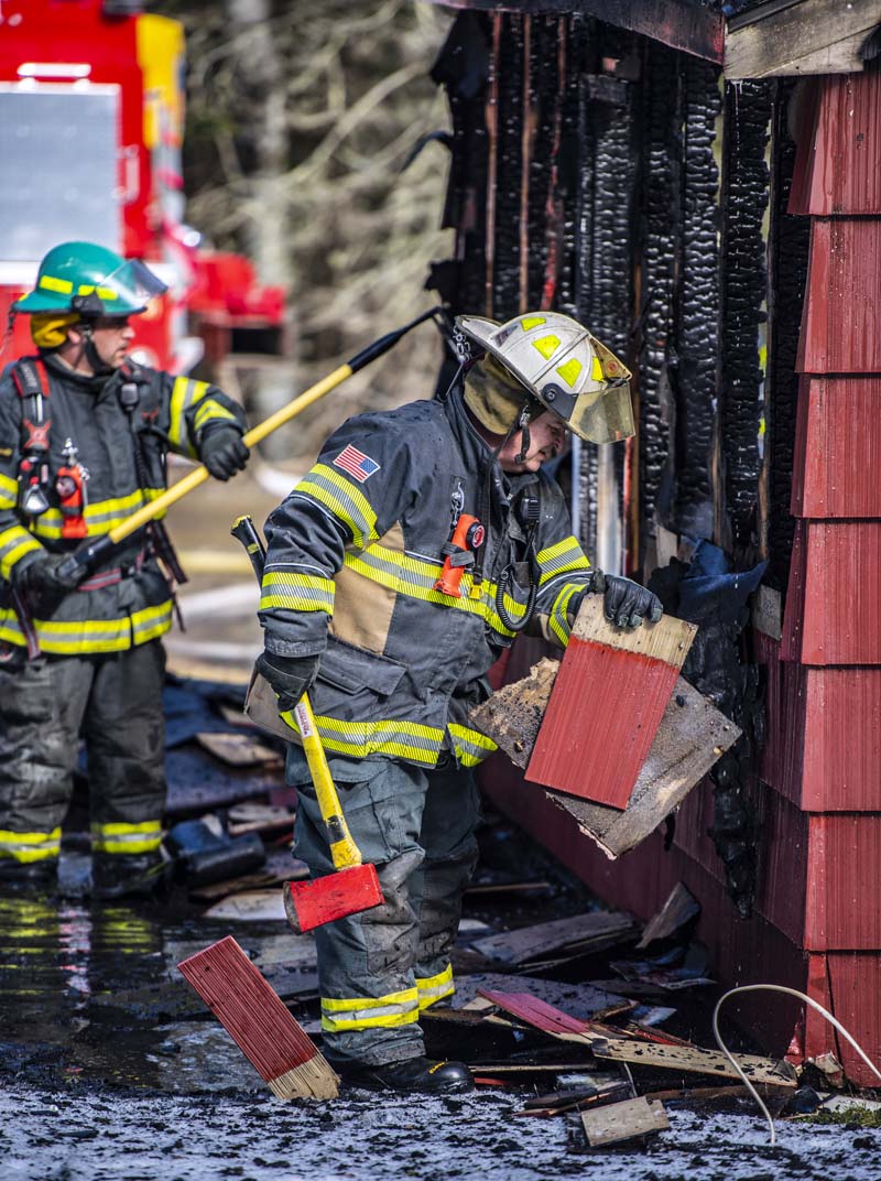 Firefighters keep a hose on the smoking remains of a garage at 56 Deaver Road in Waldoboro the morning of Wednesday, March 3. (Bisi Cameron Yee photo)