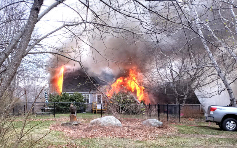 Fire engulfs an Augusta Road residence in Jefferson the evening of Friday, April 25. The home was ultimately a “total loss,” said resident Carol Mathews, who lived in the home with her sister, Janice Mathews, two dogs, and a cat. There were no injuries, however, the cat could not be found after the fire. (Photo courtesy Carol Mathews)
