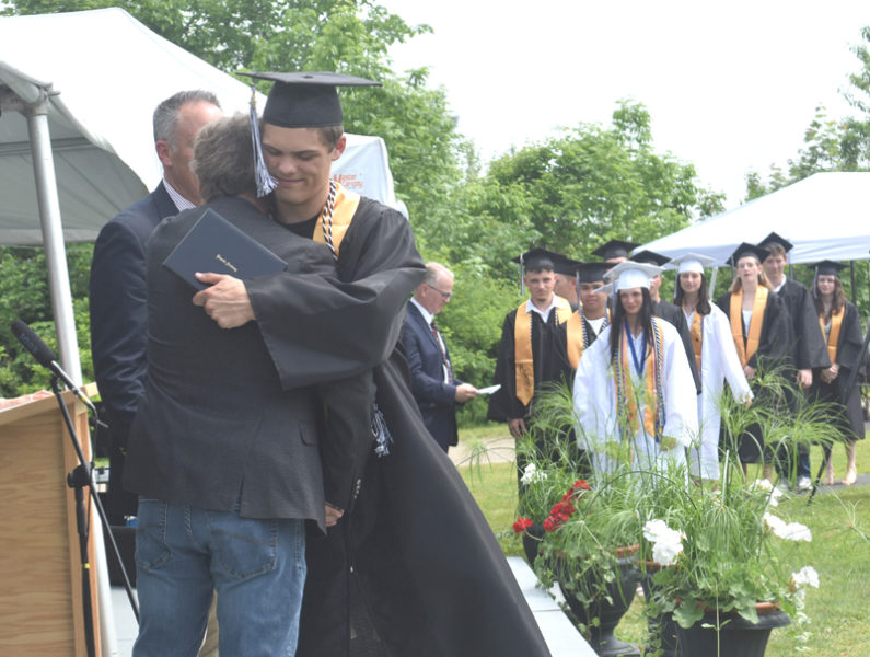 Lincoln Academy class of 2025 valedictorian Jayden Brown hugs his academic advisor, Steven Cheff, after crossing the stage at the school’s commencement Friday, June 6. In his valedictory address, Brown highlighted the importance of trying new things in order to continue learning and growing in life. (Molly Rains photo)