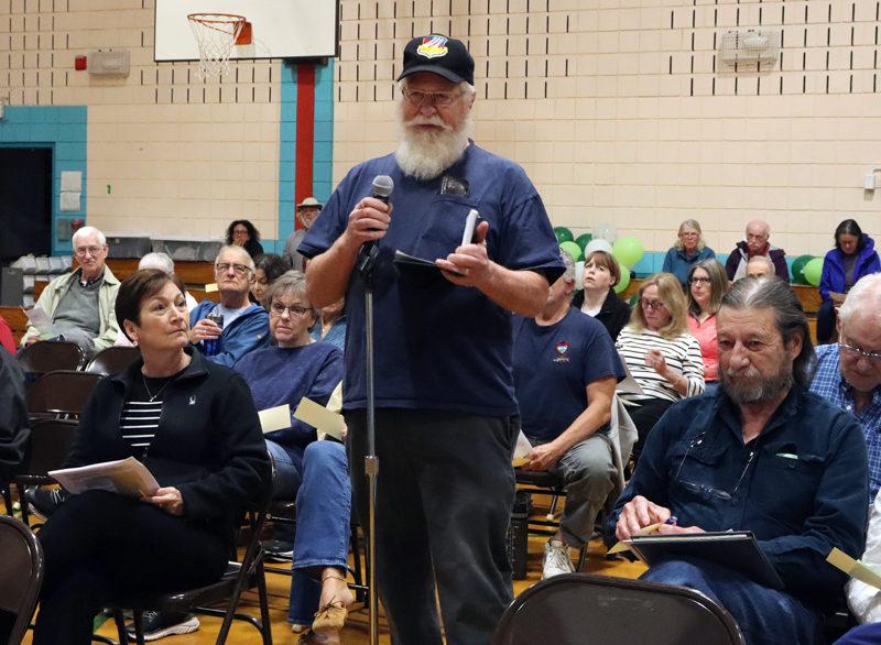 Nobleboro resident William “Bill” Soares (center) requests voters cut $400,000 from a proposed $1.4 million special education budget at a special town meeting on Saturday, May 17. Soares said due to the town’s education budget, residents have been struggling with increases in property taxes that are unsustainable. (Piper Pavelich photo)