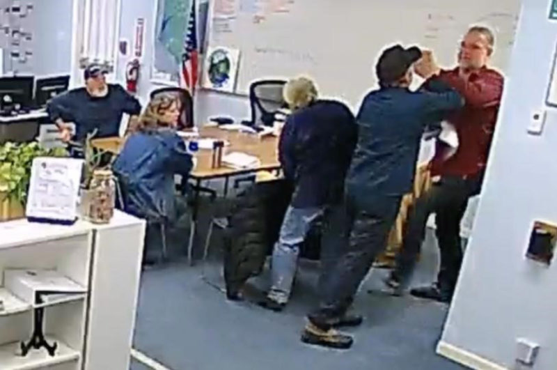 Security camera footage shows an altercation between select board member Don Chase (second from right) and budget committee member Michael Cox (right) during the budget committees March 25 meeting in the Somerville town office. Cox resigned from the select board following the event. Cox remains a member of the budget committee. (Courtesy photo)