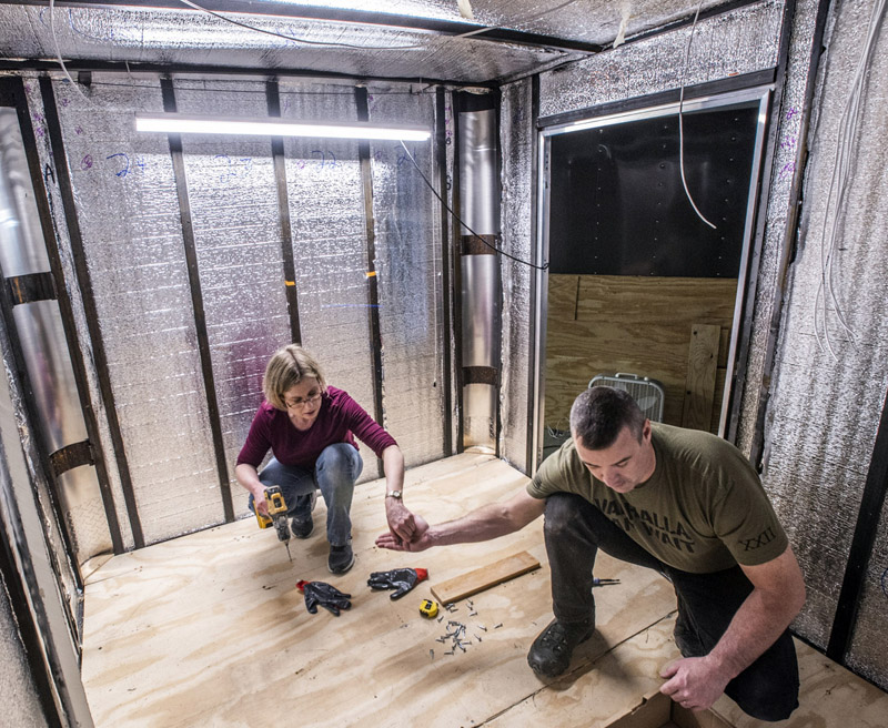 Jeremy Carter hands screws to Erica Chipman while working together to secure a plywood subfloor in a trailer in Boothbay on April 30. I think it’s absolutely admirable what they’re doing, Chipman said of Boothbay V.E.T.S. They’re stepping up to the plate. (Bisi Cameron Yee photo)