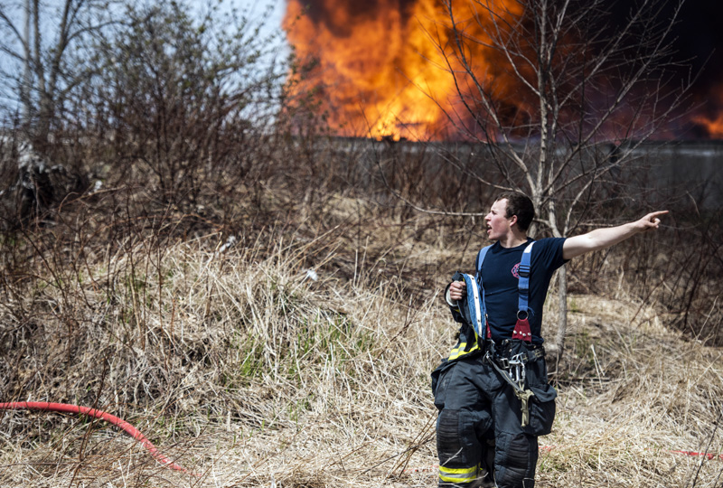 A firefighter heads toward a secondary fire after wind spread flames from a barn to a nearby field during a training exercise in Nobleboro on Saturday, April 24. (Bisi Cameron Yee photo)