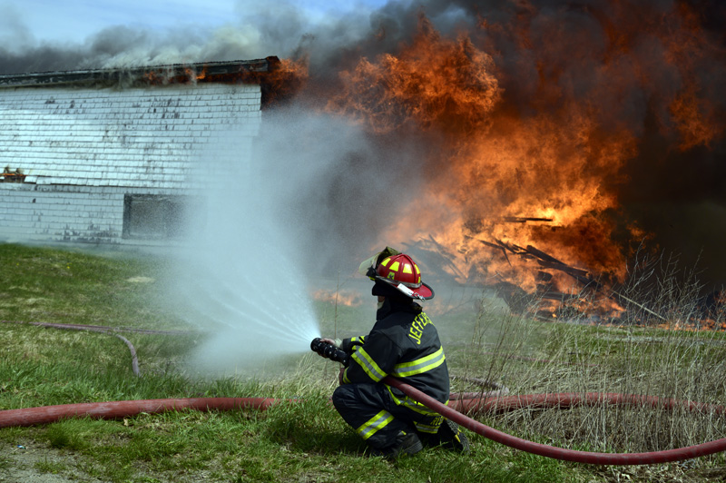Seven trainees were among the firefighters gaining live fire experience during the burning of an old chicken barn in Nobleboro on Saturday, April 24 — and a little extra training when an unplanned grass fire erupted during the exercise.