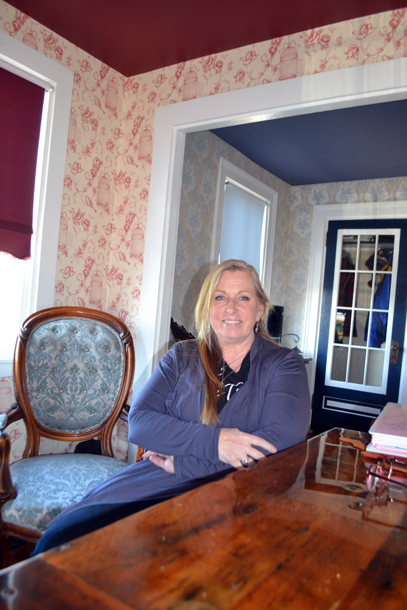 Pam Logan in the dining room of her 1790 tiny house on Fort Hill Street in Wiscasset. Logan bought the house in 2016 and restored it inside and out. (Charlotte Boynton photo)