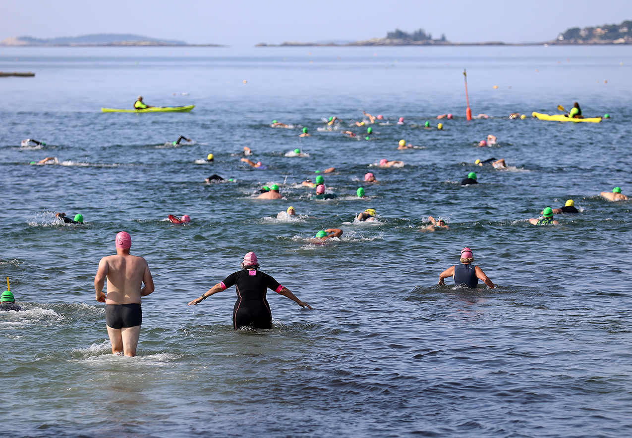 Swimmers plunge into the water at the start of the 2024 Pemaquid Beach Triathlon. (Photo courtesy Kris Christine)