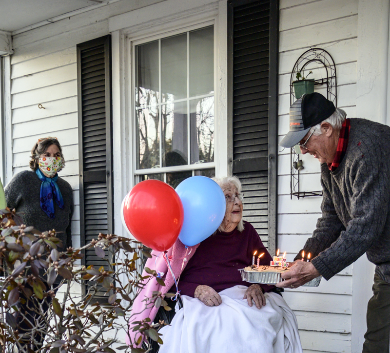 Fran Williamson observes her birthday celebration from her porch in Jefferson on Thursday, April 8. Johnston still lives on her own at 103. (Bisi Cameron Yee photo)
