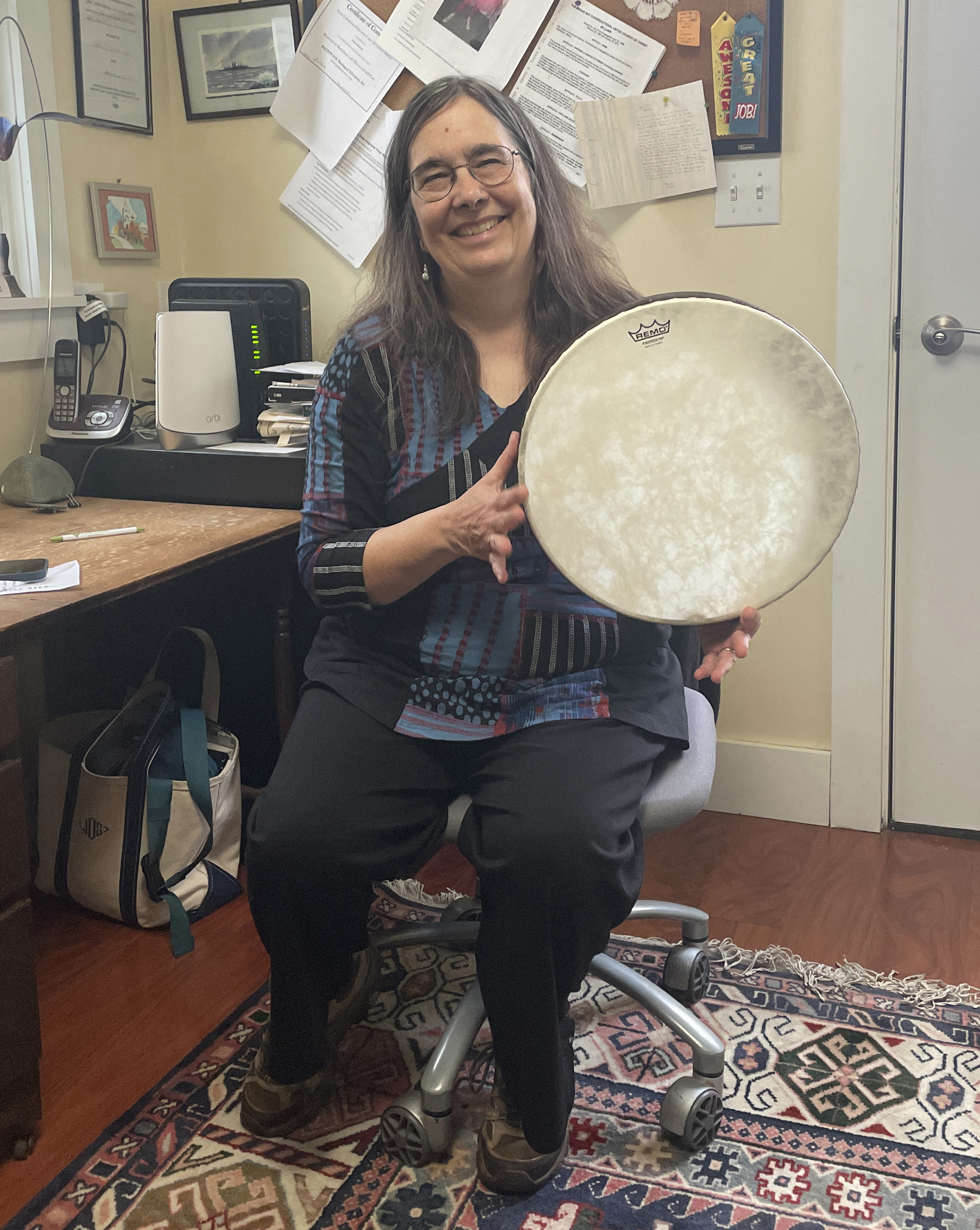 The Rev. Nancy Duncan holds a frame drum she sometimes uses as a storytelling aid while in her office at Broad Bay Congregational Church in Waldoboro. The fifth minister in the church’s 42-year history, Duncan assumed the pulpit in 2004. (Sherwood Olin photo)