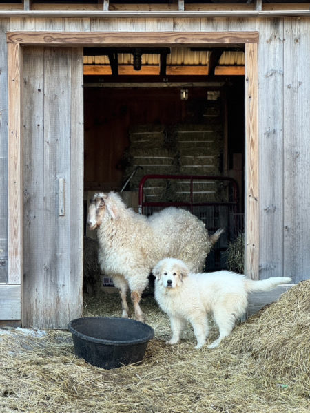 New arrival Popcorn, or “Po,” the goat with white pup Moses. (Photo courtesy Katherine Dunn)