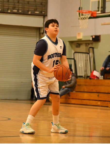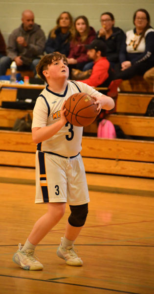 Joshuan Stetson lines up a long shot during Boothbay’s 33-29 loss to Brunswick in the Wiscasset grade 5-6 boys basketball tournament on Thursday, March 26 in Wiscasset. (Mic LeBel photo)