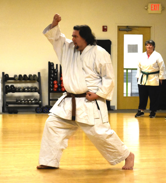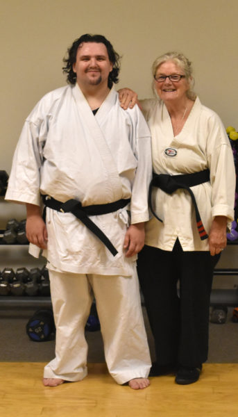 Ben Olmstead was presented with a black belt by sensei Linda Porter during a Mobius martial arts class at the Central Lincoln County YMCA on Sept. 3 in Damariscotta. Before tying on the black belt in a ritual with his teacher, Olmstead demonstrated his martial arts skills in front of Porter, classmates, friends and family that had gathered at the ceremony.