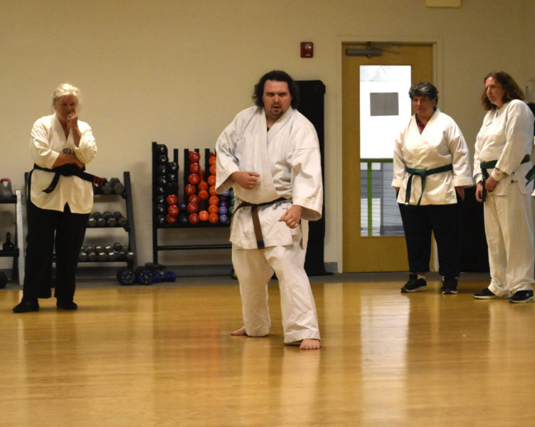 Ben Olmstead (center) takes a test to earn his black belt while under the close observation of his martial arts teacher Linda Porter (left) and fellow students from Mobius on Sept. 3 at the CLC YMCA in Damariscotta. (Mic LeBel photo)