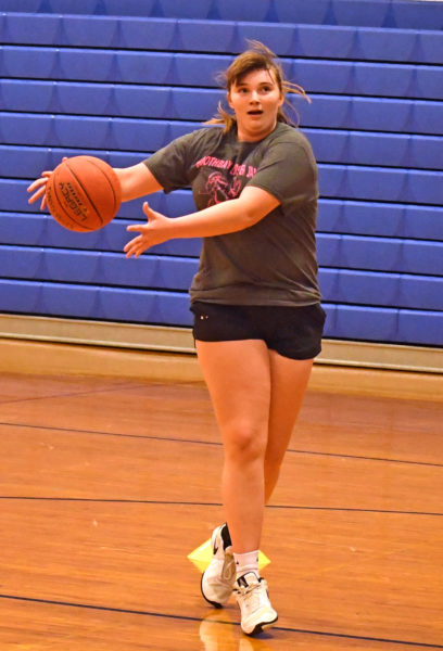 Senior Tatum French performs a ball-handling drill during Boothbay’s first practice on Monday, Nov. 17. French was the leading scorer for the Seahawks last season. (Mic LeBel photo)