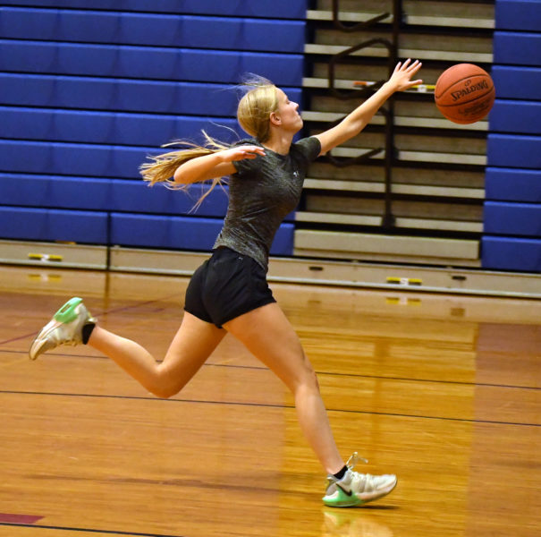 Sophomore guard Arabella Hodgdon chases down a pass during the first practice of the season for the Boothbay girls basketball team on Monday, Nov. 17. (Mic LeBel photo)