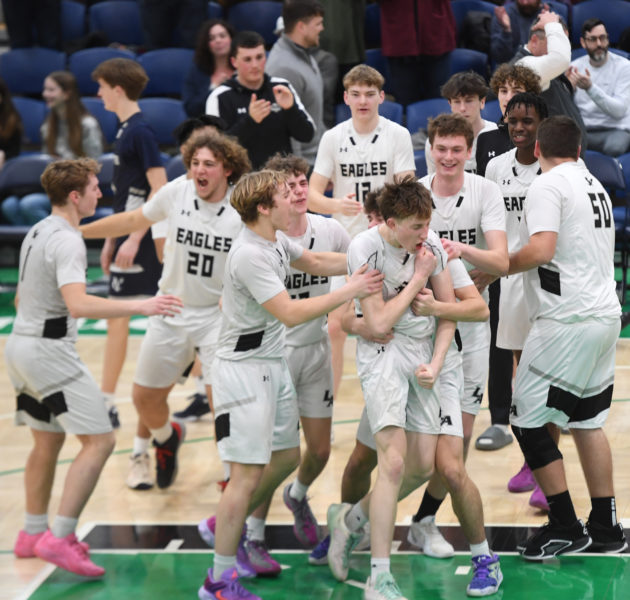 Lincoln Academy players storm onto the court after beating Yarmouth 59-57 in overtime in a Class B South quarterfinal on Feb. 14 in Portland. (Mic LeBel photo)