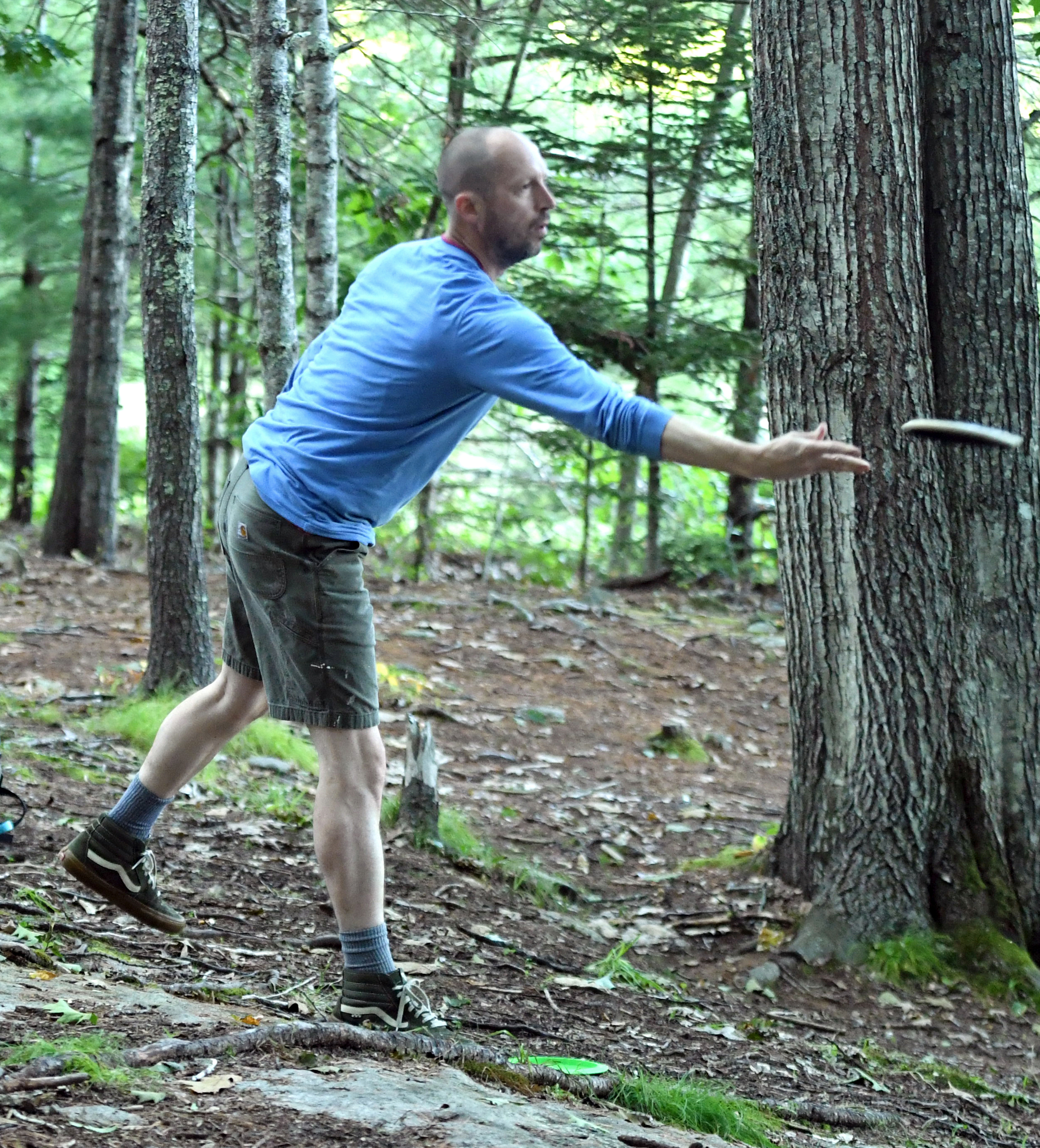 - Bear Ewing tosses a forehand drive during a Random Doubles league match at Cider Hill Farm Disc Golf on Tuesday, Aug. 19 in Waldoboro. (Mic LeBel photo)
