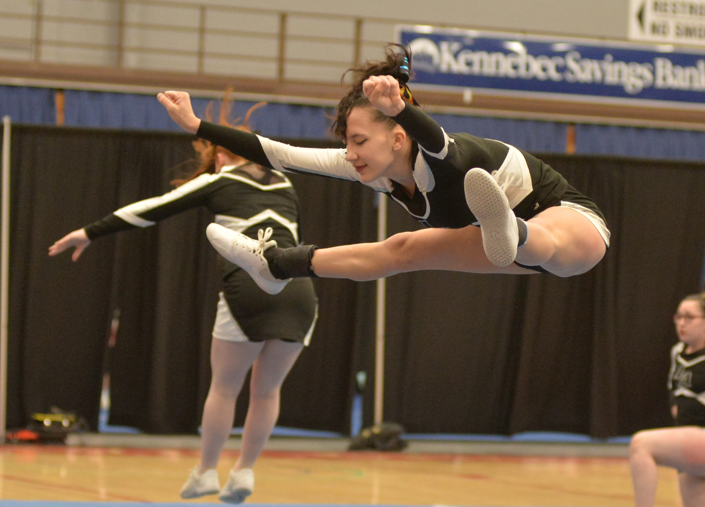 A Lincoln Academy cheerleaders performs a split leap. (Paula Roberts photo) January 21, 2023 at 9:26 pm Paula Roberts
