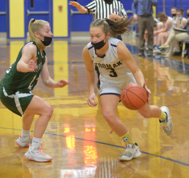 Alyssa Creamer dribbles past a Mustang defender. (Paula Roberts photo) December 17, 2021 at 10:19 pm Paula Roberts