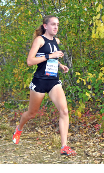 Lincoln Academy’s Karen Higgins placed fifth in the girls seeded cross country race at the Maine Festival of Champions on Saturday, Oct. 4 in Belfast. (Mic LeBel photo)