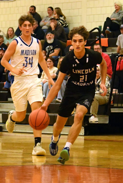 Aidyn Herring bolts to the hoop during Lincoln Academy’s 42-34 win over Madison in a preseason tournament on Saturday, Nov. 22 in Skowhegan. (Mic LeBel photo)