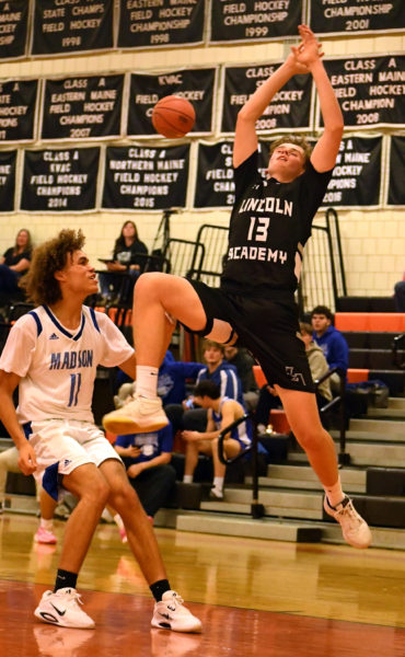 Michael Mitchell gets fouled during Lincoln Academy’s 42-34 win over Madison in a preseason tournament on Saturday, Nov. 22 in Skowhegan. (Mic LeBel photo)