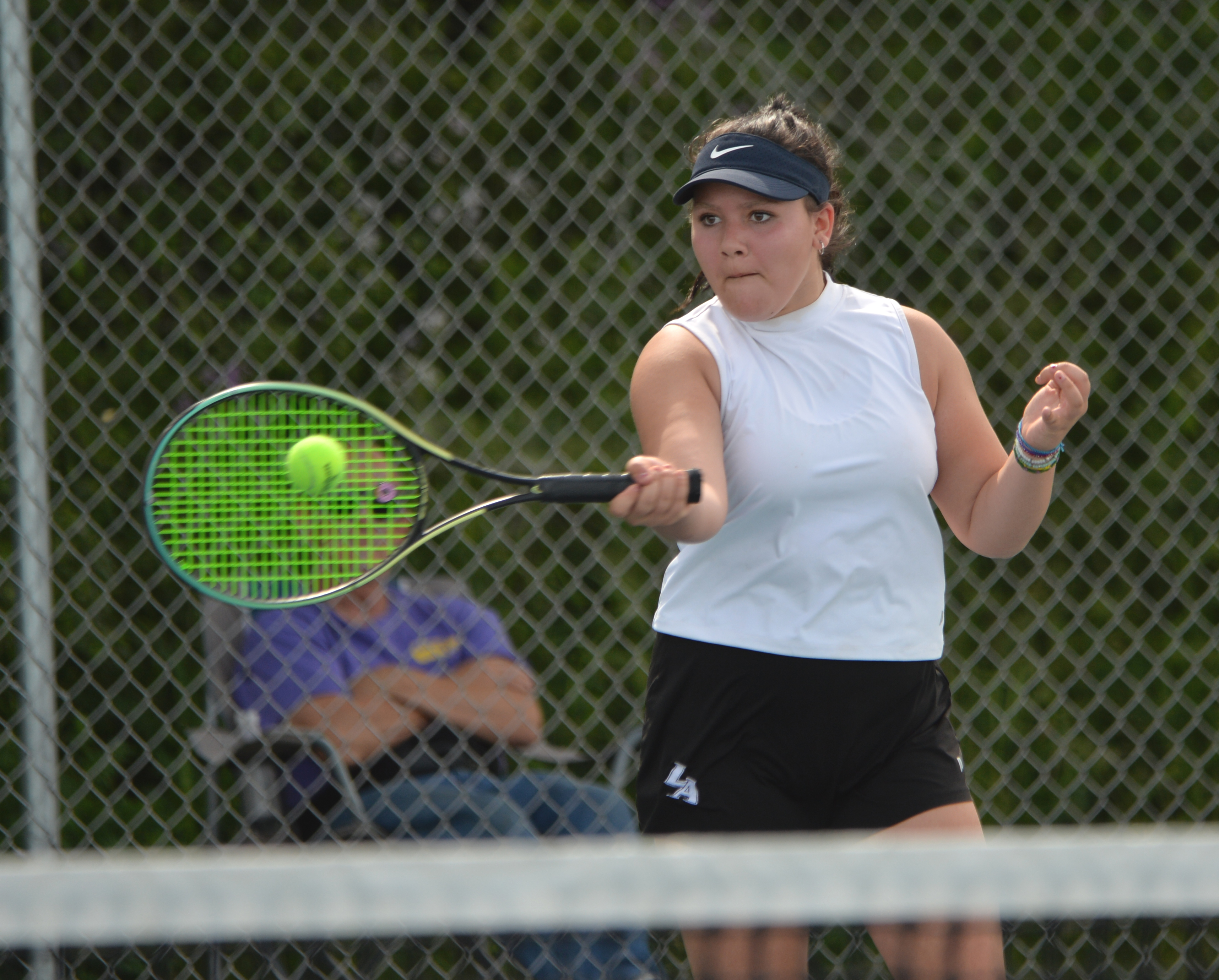 Olive Siegel returns a shot in LA second doubles action. (Paula Roberts photo) June 11, 2022 at 3:26 pm Paula Roberts