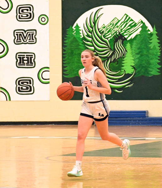 Chloe Anderson brings the ball up the court during Lincoln Academy’s loss to Gray-New Gloucester in a preseason tournament game at Spruce Mountain High School on Saturday, Nov. 22 in Jay. (Mic LeBel photo)