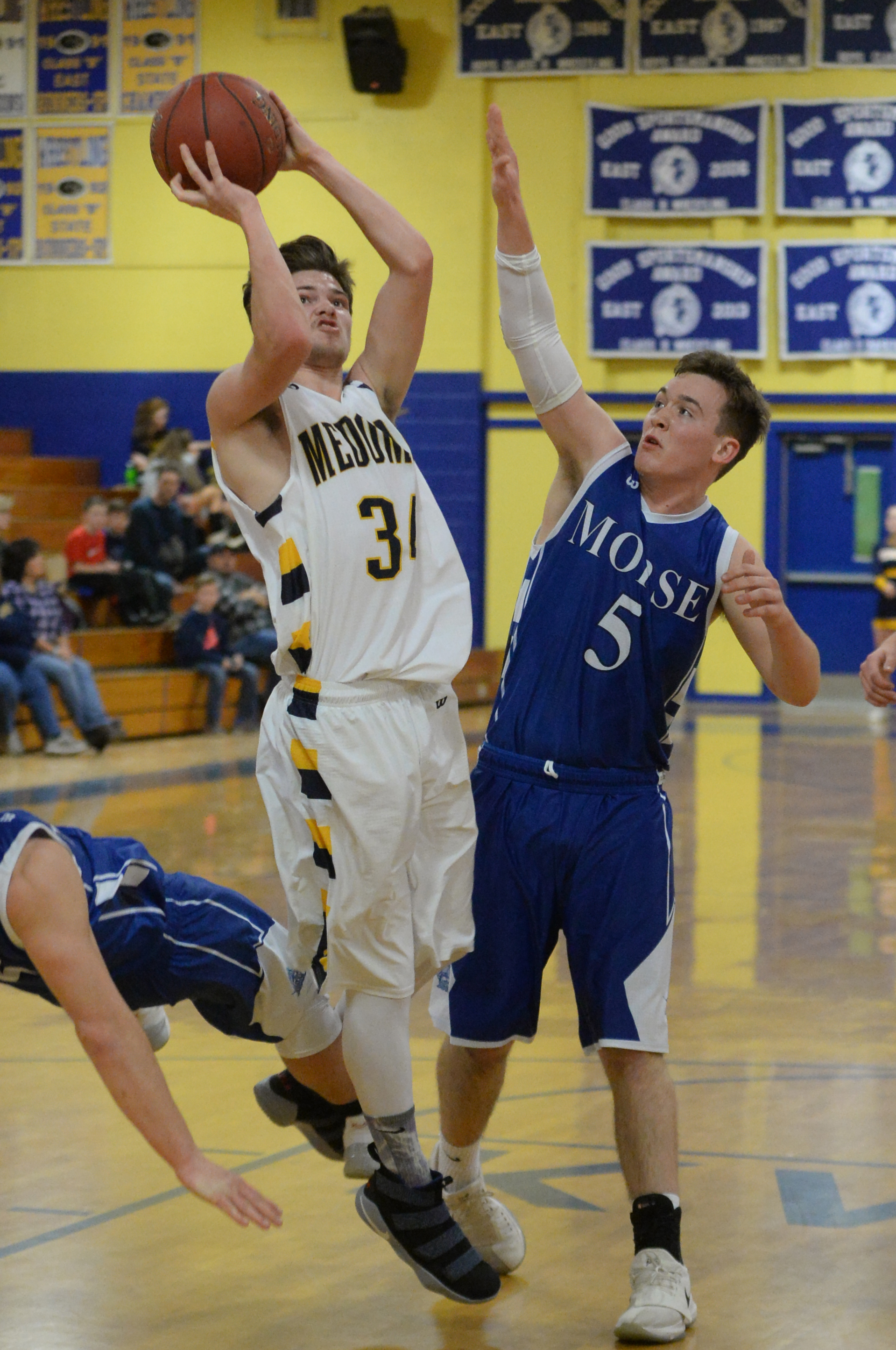 Josh Goldrup splits a pair of Morse defenders. (Paula Roberts photo) January 19, 2018 at 9:46 pm Paula Roberts