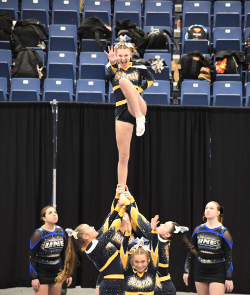 The Medomak Valley cheering team leaps into the air during the KVAC Class B championship on Saturday, Jan. 17 at the Augusta Civic Center. (Mic LeBel photo)