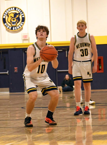 Luke Cheesman lines up a foul shot during Medomak Valley’s 65-50 loss to Camden Hills on Tuesday, Dec. 16 in Waldoboro. (Mic LeBel photo)