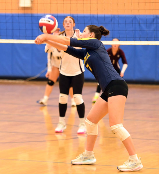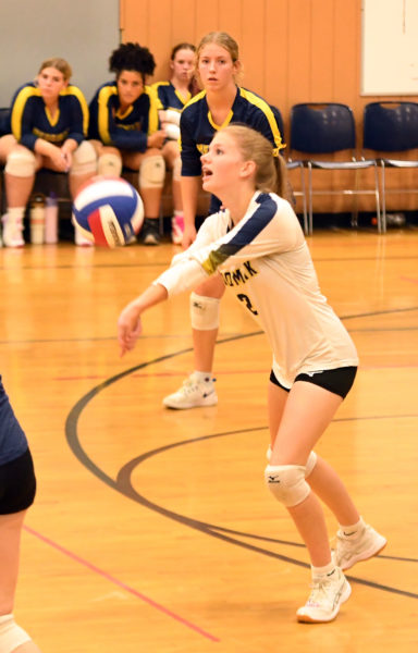 Katie Bickel keeps the play alive during Medomak’s 3-0 sweep over Nokomis on Thursday, Sept. 25 in Waldoboro. (Mic LeBel photo)