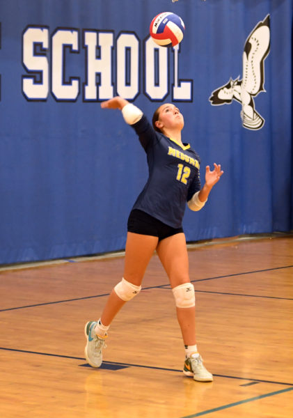 Andi Winchenbach serves the ball during Medomak’s 3-0 sweep over Nokomis on Thursday, Sept. 25 in Waldoboro. (Mic LeBel photo)